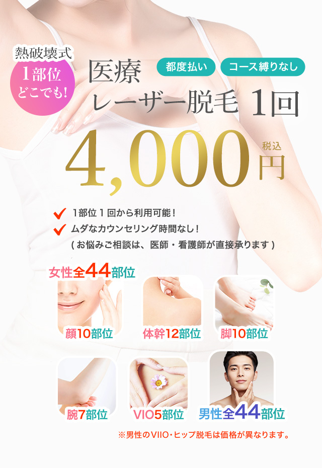 当院は都度払い制なので、好きな部位を選んで1部位1回からご利用可能です。